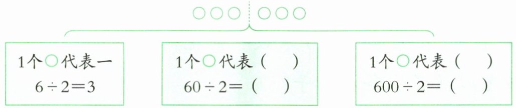 1个$○$代表十,$60 ÷ 2 = 30$;1个$○$代表百,$600 ÷ 2 = 300$。