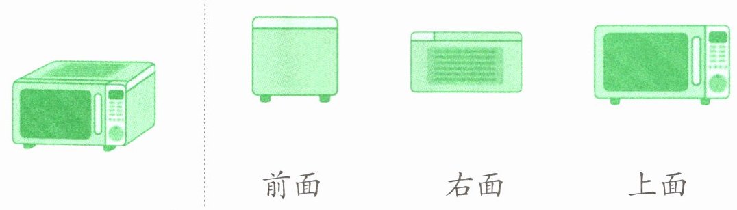 从前面观察微波炉,能看到带有门和控制面板的正面;从右面观察,看到的是微波炉较窄的侧面,有凸起的部分;从上面观察,看到的是微波炉的顶部。据此连线:第一个图形连右面,第二个图形连上面,第三个图形连前面。