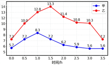在某医学实验中,首先测定甲、乙两人的血糖浓度,然后给他们饮用等量的葡萄糖溶液。3.5h 内,每隔 0.5h 给两人测一次血糖浓度,并将测得的数据记录在下表中。请据表回答问题。