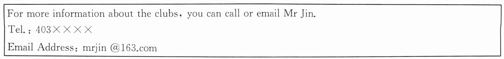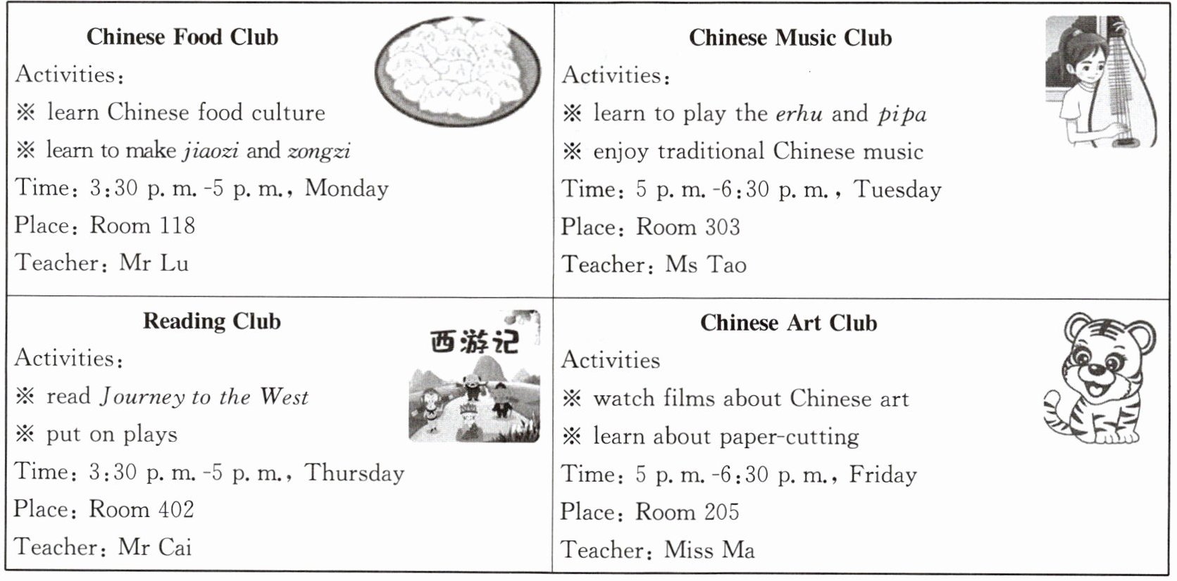 答案:1. B 【点拨】根据 Chinese Music Club 中“Place:Room 303”以及“learn to play the erhu and pipa”可知,可以学习拉二胡。故选 B。