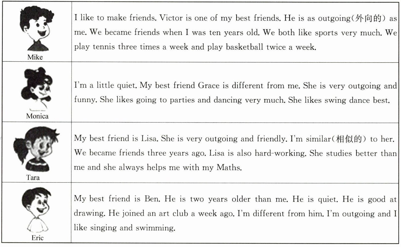 My best friend is Ben. He is two years older than me. He is quiet. He is good at drawing. He joined an art club a week ago. I’m different from him. I’m outgoing and I like singing and swimming.