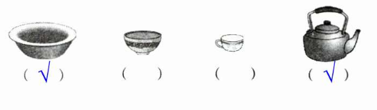 2. 1升有多少?右面哪些容器的容量比1升大?请在括号里画“√”。