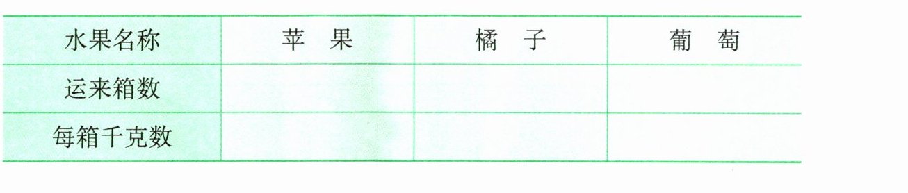 2. 水果店运来 6 箱苹果、5 箱橘子和 2 箱葡萄。苹果每箱 12 千克,橘子每箱 10 千克,葡萄每箱 9 千克。(先把条件整理在表里,再解答)