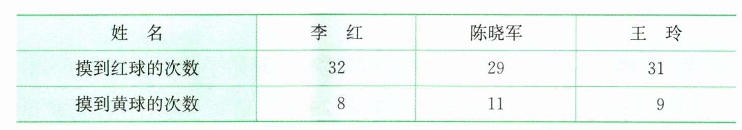 3. 李红、陈晓军和王玲三人做摸球游戏,在同一个口袋里摸球,每次任意摸出1个球,摸后放回,每人摸40次。下面是他们的摸球记录。