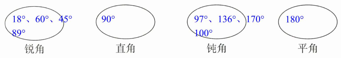 锐角、直角、钝角、平角、周角;锐角<直角<钝角<平角<周角