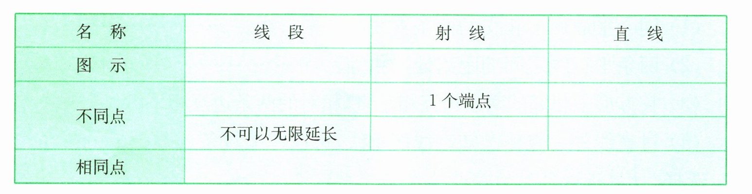 首先,我们根据线段、射线、直线的定义来填写表格。