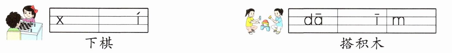 “下棋”的“下”拼音是xià,补充“ià”;“棋”拼音是qí,补充“q”。“搭积木”的“积”拼音是jī,补充“j”;“木”拼音是mù,补充“ù”。