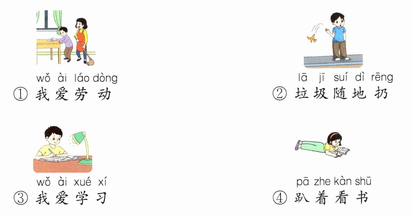 根据“我是小学生”的行为规范,①“我爱劳动”和③“我爱学习”是正确的做法;②“垃圾随地扔”和④“趴着看书”是不良行为,应排除。