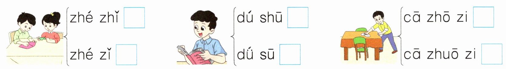 第一组:“折纸”的正确拼音是“zhé zhǐ”,所以选择“zhé zhǐ □”。