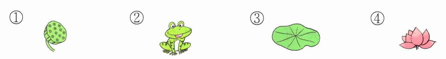 2. 儿歌中提到“荷花”“荷叶”“莲子”“莲蓬”,对应图片①(莲蓬)、③(荷叶)、④(荷花),青蛙未提及。