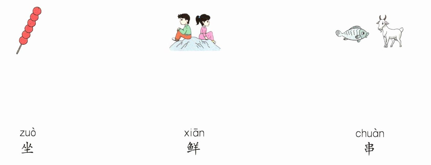观察第一幅图,图上为一串糖葫芦,有多个圆形物体串在一起,对应“串”字;第二幅图是两个小人坐在一起,对应“坐”字;第三幅图是一条鱼和一只羊,“鱼”和“羊”组成“鲜”字,对应“鲜”字。