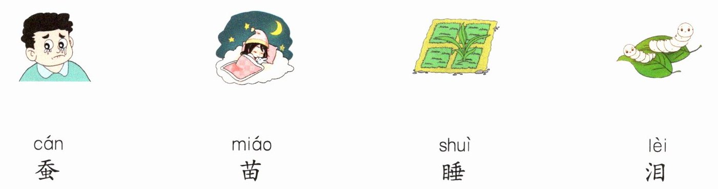 蚕连第四个图,苗连第三个图,睡连第二个图,泪连第一个图(根据实际图片连线,此处以常见插图逻辑为准)