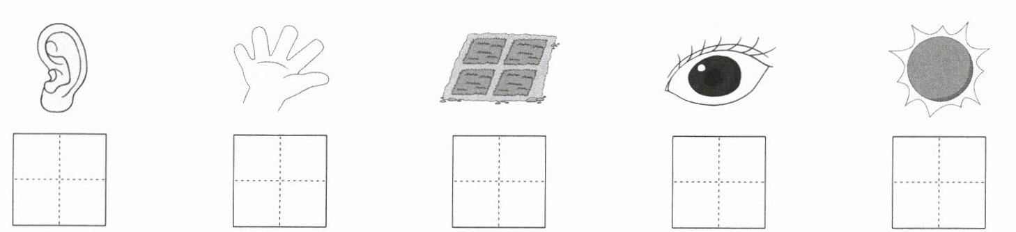 观察图片依次为耳朵、手、田字格、眼睛、太阳,对应人教版语文一年级上册第一单元所学汉字“耳、手、田、目、日”。
