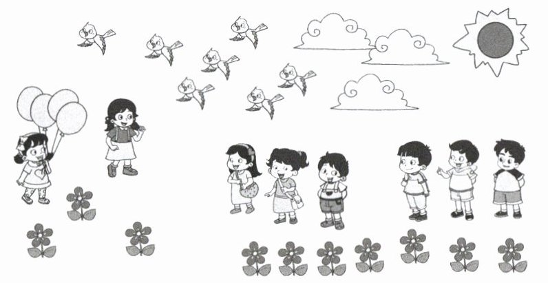 观察插图,数出太阳1个,白云3朵,气球4个,小鸟7只,小花10朵,小朋友8个,用汉字数字填写。