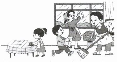 观察插图,从左到右依次为:小女孩(小红)在擦桌子;小男孩(弟弟/哥哥)端着水盆,推测在换水;穿围裙的女性(妈妈)在擦窗户;拿着扫帚的男性(爸爸)在扫地。根据题目要求,第一空填扫地的人物,即爸爸;第二空填换水的人物,即弟弟/哥哥(一年级通常用“弟弟”更常见);第三空填小红的行为,即擦桌子;第四、五空填剩余人物(妈妈)及其行为(擦窗户)。注意用拼音填写。