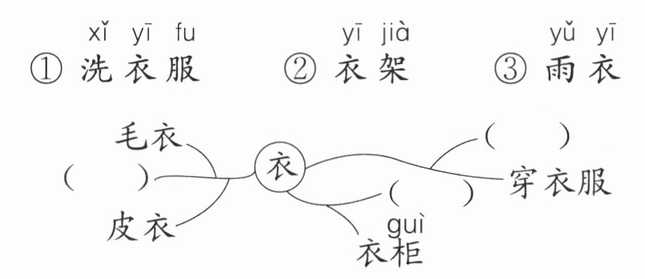 观察图形,中心字为“衣”。左侧“毛衣、皮衣”都是衣物名称,③“雨衣”也是衣物,应填左侧括号;右侧“衣柜”是存放衣物的家具,②“衣架”也是挂衣物的用具,应填“衣柜”旁括号;“穿衣服”是动作,①“洗衣服”也是动作,应填“穿衣服”旁括号。