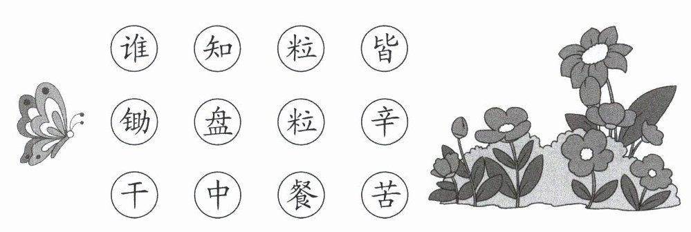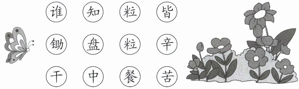 答案:蝴蝶从“谁”出发,依次经过“谁”“知”“盘”“中”“餐”“粒”“粒”“皆”“辛”“苦”,最后飞到花上(按照诗句顺序连接)。