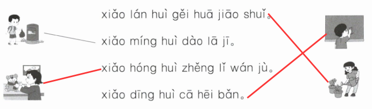 十一、图上的小朋友们会做什么?请你连一连,再写一写你会做什么家务。(用拼音作答)(10分)
