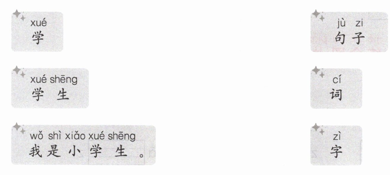 答案:xué 学——zì 字;xué shēng 学生——cí 词;wǒ shì xiǎo xué shēng 我是小学生。——jù zi 句子