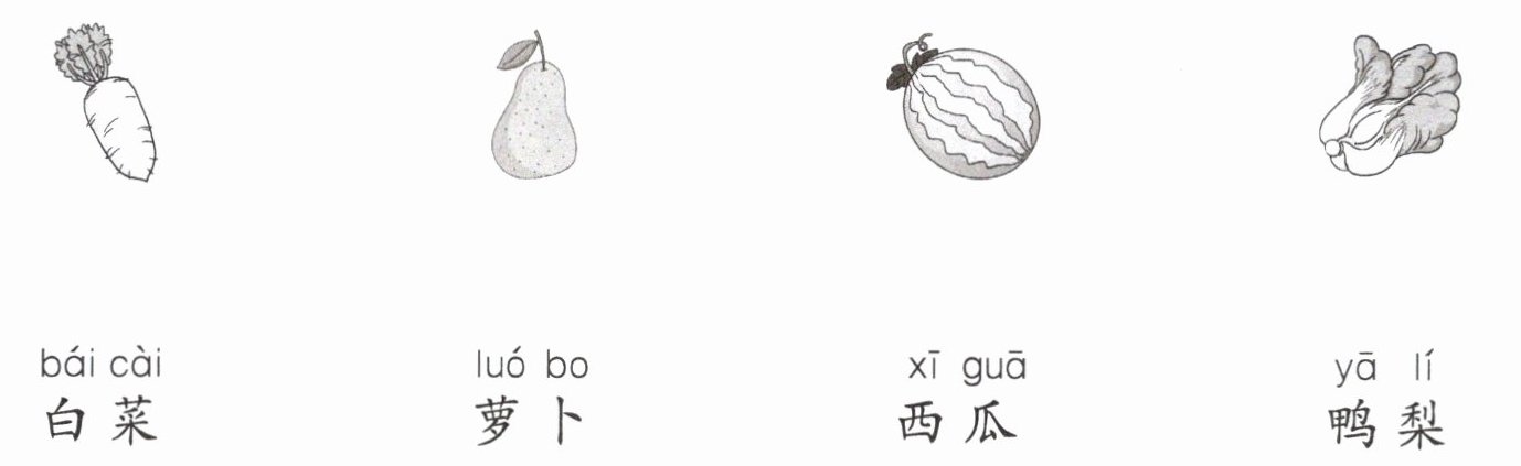 答案:(第一个图连luó bo 萝卜,第二个图连yā lí 鸭梨,第三个图连xī guā 西瓜,第四个图连bái cài 白菜)