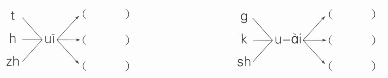 根据声母与韵母的拼读规则,将左侧声母分别与右侧韵母组合。第一组声母t、h、zh与韵母uī拼读,依次为tuī、huī、zhuī;第二组声母g、k、sh与韵母uài拼读,依次为guài、kuài、shuài。