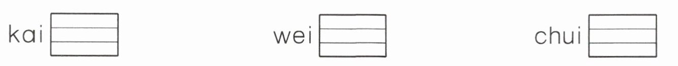 本题要求从给定的音节中找出隐藏的复韵母。复韵母是由两个或三个元音结合而成的韵母。在“kai”中,复韵母是“ai”;在“wei”中,复韵母是“ei”(这里“wei”实际整体认读,但按题目要求找复韵母,其包含“ei”的发音相关复韵母形式,在一年级上册学习范围内可如此认定);在“chui”中,复韵母是“ui”。