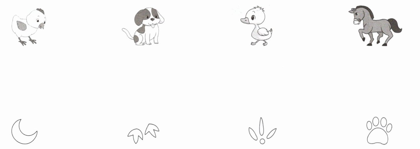 答案:从左至右小鸡连竹叶(第三幅爪印图),小狗连梅花(第四幅爪印图),小鸭连枫叶(第二幅爪印图),小马连月牙(第一幅月牙图 )。 (按题目从左到右动物顺序,对应连线爪印或图形从左到右顺序)