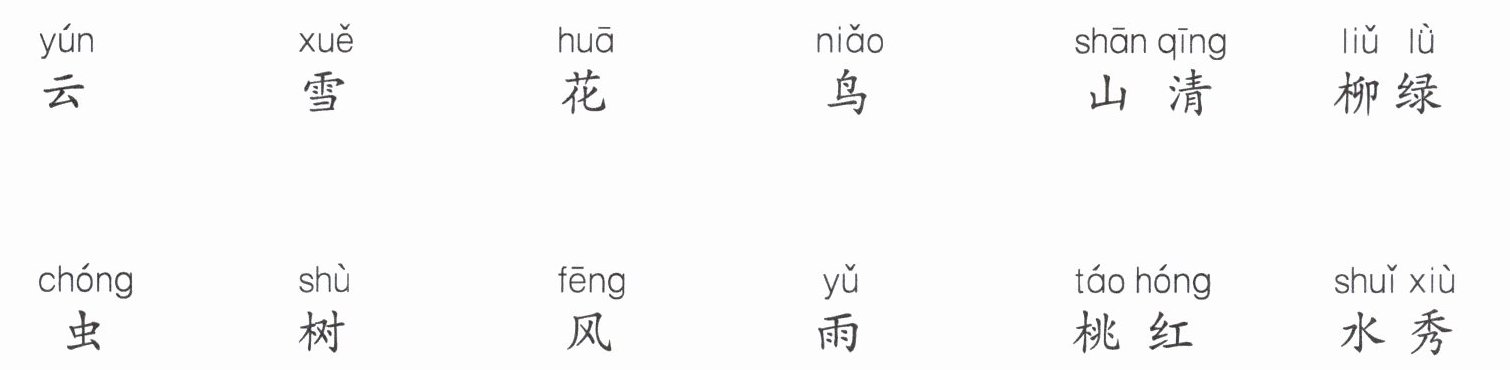 答案:云—风,雪—雨,花—树,鸟—虫,山清—水秀,柳绿—桃红