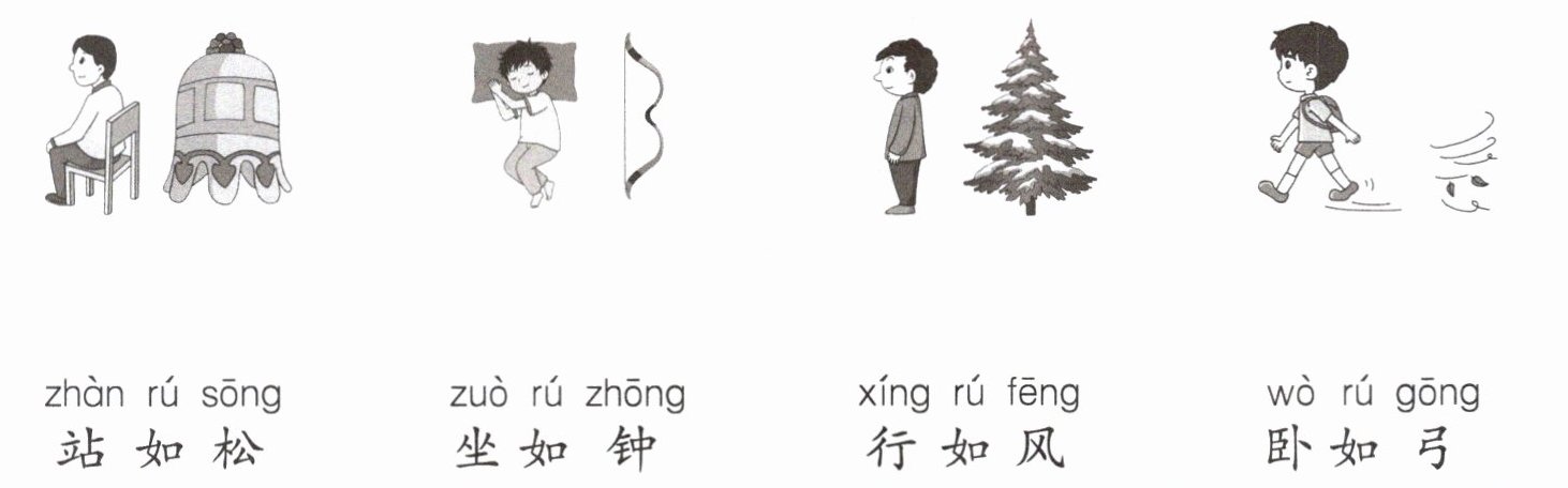 观察图片,第一张图是坐着的人和钟,对应“坐如钟”;第二张图是躺着的人和弓,对应“卧如弓”;第三张图是站着的人和松树,对应“站如松”;第四张图是行走的人和风,对应“行如风”。