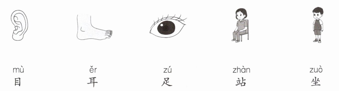 根据图片内容与汉字、拼音的对应关系连线。耳朵图片连“ěr耳”,脚图片连“zú足”,眼睛图片连“mù目”,坐着的人图片连“zuò坐”,站着的人图片连“zhàn站”。