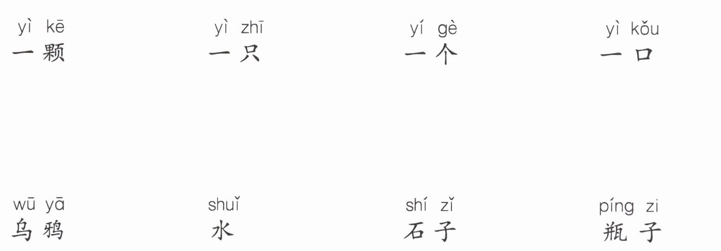 答案:一颗—石子 一只—乌鸦 一个—瓶子 一口—水