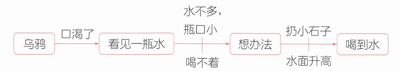 答案:一只乌鸦口渴了,到处找水喝,它看见一个瓶子,瓶子里有水。可是水不多,瓶口又小,乌鸦喝不着水。怎么办呢?乌鸦看见旁边有许多小石子,它想出办法来了。乌鸦把小石子一颗一颗地放进瓶子里,瓶子里的水渐渐升高,乌鸦就喝着水了。