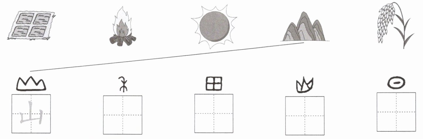 观察图片,第一行依次为田、火、日、山、禾的插图,第二行依次为山、禾、田、火、日的象形文字。根据象形字与实物的对应关系连线,再写出汉字。