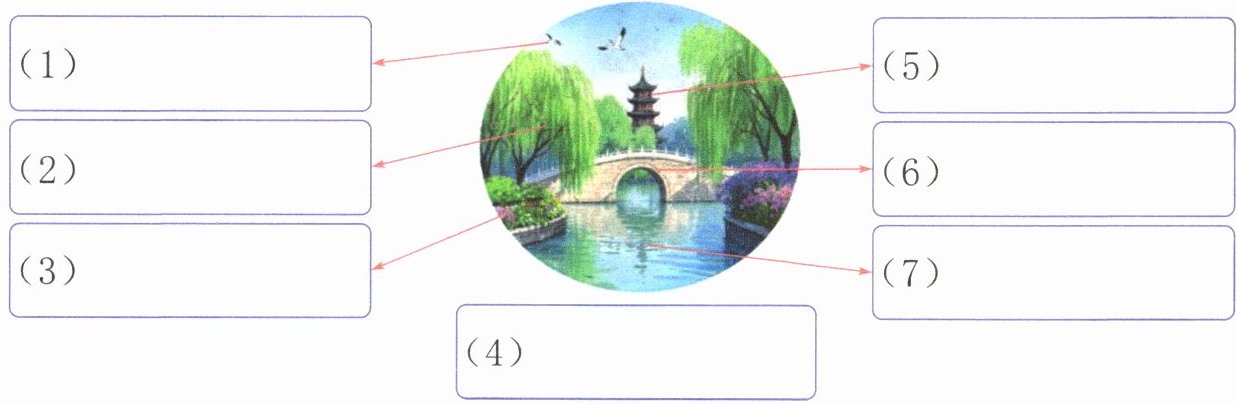 (1)柳条 (2)花儿 (3)白鹭 (4)瘦西湖 (5)栖灵塔 (6)二十四桥 (7)碧水