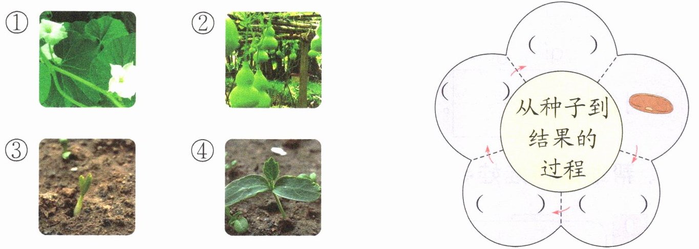 3. ③→④→①→(原排序图整体顺序) (按从种子到结果过程对应图中序号应为从③种子发芽→④幼苗生长→①开花这一生长阶段(原题中此小题整体排序要求按葫芦生长顺序排给定四幅图序号,答案为③④①② )