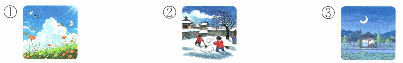 第一幅图展示的是白天有太阳和花朵的景象,不能直观体现“寒冬腊月”或“夜幕降临”;第二幅图呈现了下雪的场景,有积雪,人们穿着厚衣服,能很好地体现“寒冬腊月”的寒冷;第三幅图描绘的是月亮高挂,天色已黑的画面,能很好地体现“夜幕降临”。所以借助图②能理解“寒冬腊月”的意思,借助图③能理解“夜幕降临”的意思。