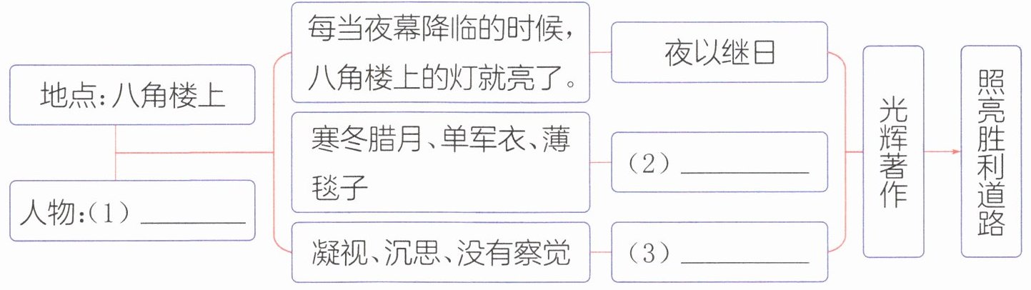 2. 思维导图中人物是毛主席,对应②;“寒冬腊月、单军衣、薄毯子”体现条件艰苦,对应①;“凝视、沉思、没有察觉”体现专注忘我,对应③。