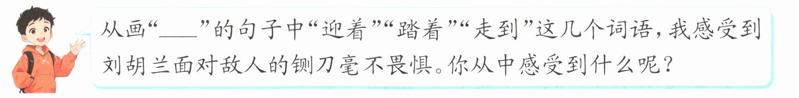 从画“____”的句子中“迎着”“踏着”“走到”这几个词语,我感受到刘胡兰面对敌人的铡刀毫不畏惧。你从中感受到什么呢?