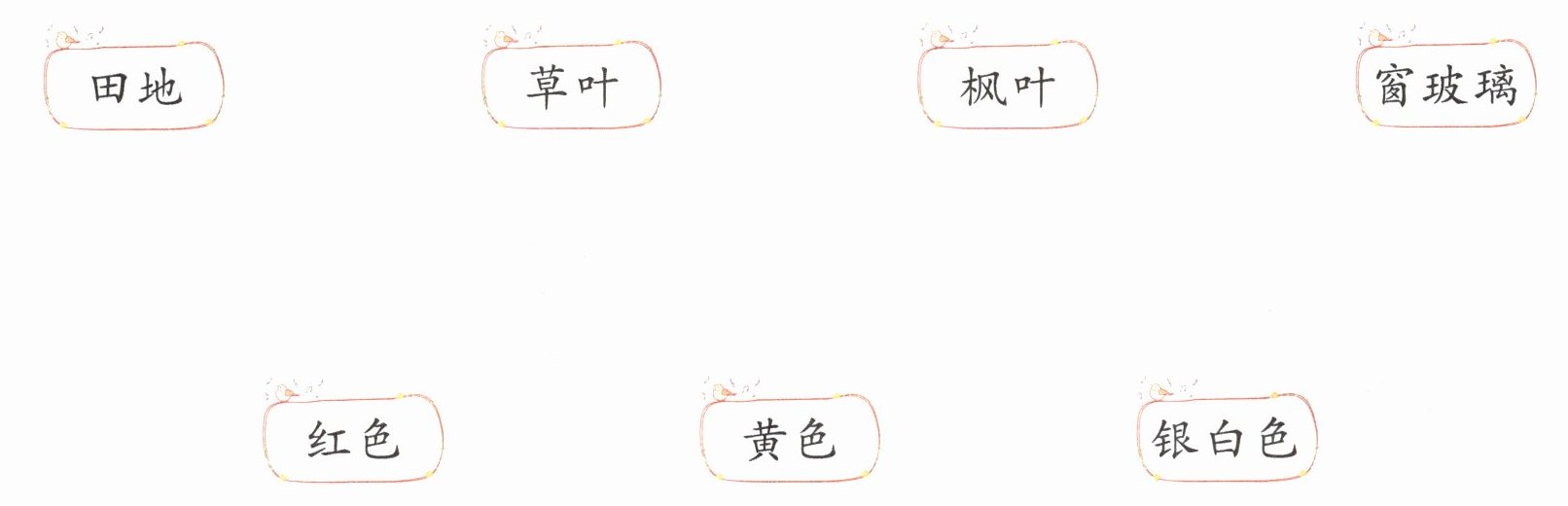 2. 文中提到“把草叶和一些树叶涂成黄色,把一些树叶涂成红色(枫叶属于树叶,可推测为红色)”“蘸着银白色来画田地”“蘸着银白色来画人家的窗玻璃”,据此连线。