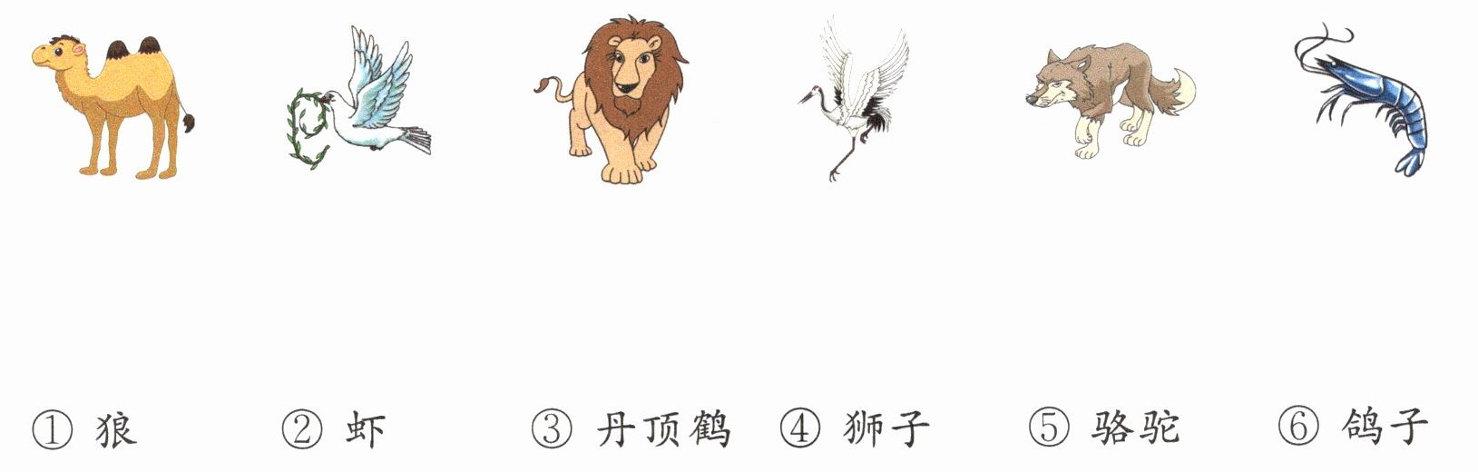 ① 狼 ② 虾 ③ 丹顶鹤 ④ 狮子 ⑤ 骆驼 ⑥ 鸽子