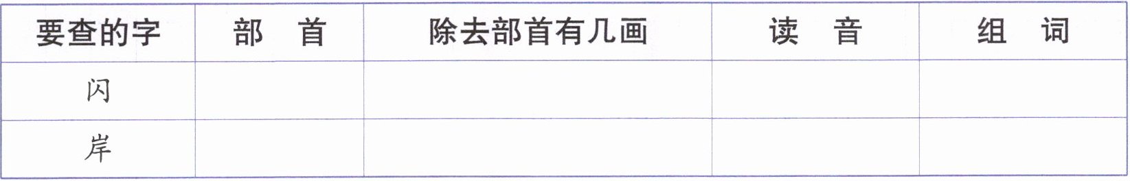 答案:|要查的字|部首|除去部首有几画|读音|组词|