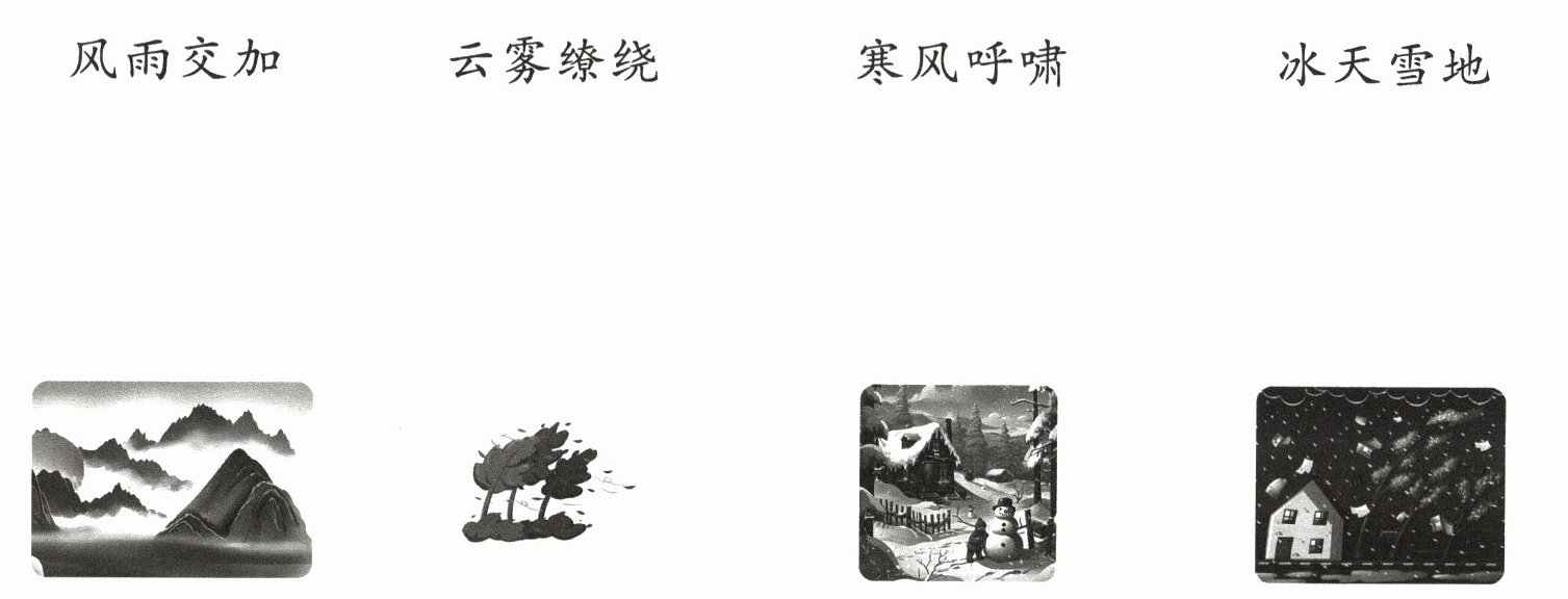 1. "云雾缭绕"形容云和雾回旋上升,多与山水搭配,对应第一幅水墨山水图;2. "寒风呼啸"指寒冷的风发出高而长的声音,图中树木被风吹得倾斜,符合该情景,对应第二幅图;3. "冰天雪地"形容冰雪漫天盖地,图中有积雪覆盖的木屋和雪人,对应第三幅图;4. "风雨交加"指又是刮风又是下雨,图中房屋在风雨中,有雨点和被吹落的物品,对应第四幅图。