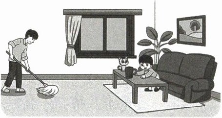 星期天,小明和爸爸在客厅进行大扫除。爸爸拿着拖把认真拖地,不放过任何一个角落。小明在擦桌子,一边擦一边哼着小曲,干得特别起劲。小明和爸爸齐心协力,把客厅打扫得干干净净。阳光从窗户照进来,客厅里亮亮的。看着整洁的客厅,他们脸上都洋溢着幸福的笑容。