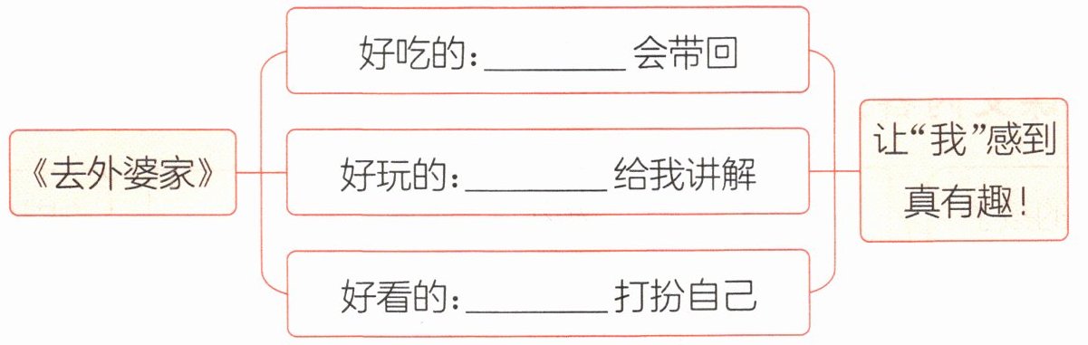 本题需根据课文《去外婆家》的内容来完成思维导图,要明确好吃的、好玩的、好看的分别对应的人物。根据课文内容可知好吃的是外婆会带回,好玩的是舅舅给“我”讲解,好看的是舅妈打扮自己。