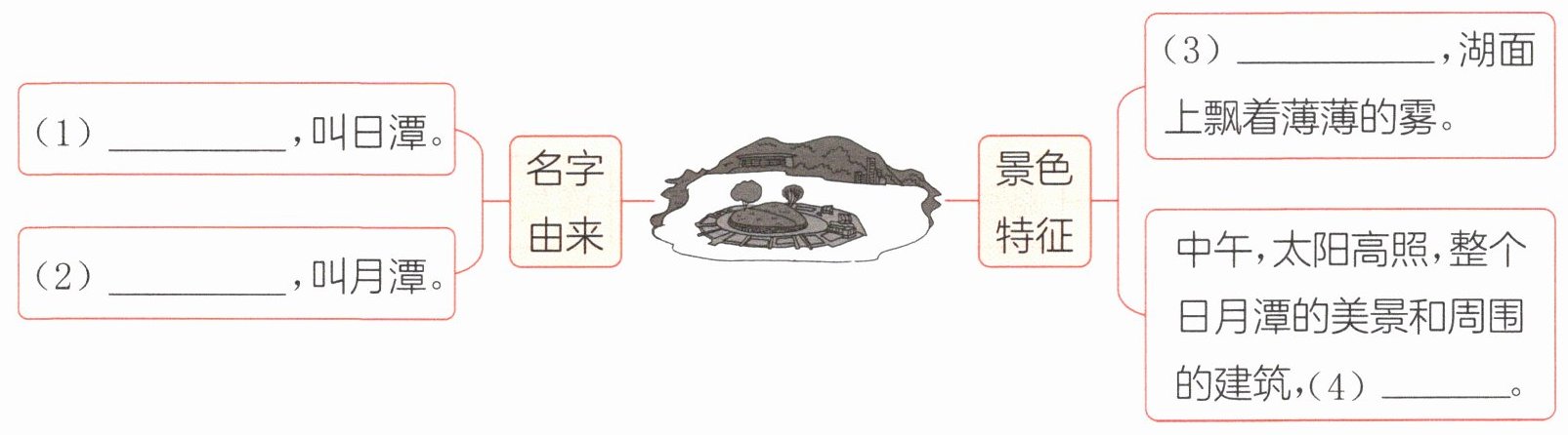根据课文《日月潭》内容,“名字由来”部分,湖中央的小岛把湖水分成两半,北边像圆圆的太阳叫日潭,南边像弯弯的月亮叫月潭;“景色特征”部分,清晨湖面上飘着薄薄的雾,中午太阳高照时美景和建筑都清晰地展现在眼前。