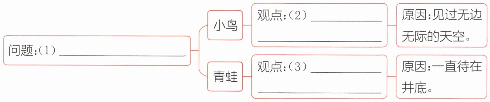 答案:(1)天空有多大?(2)天空无边无际。(3)天只有井口那么大。②