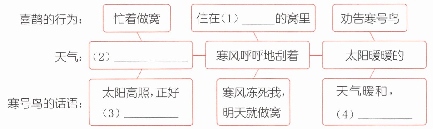根据课文《寒号鸟》内容,喜鹊勤劳做窝,住在温暖的窝里;天气变化依次为秋天、寒风呼呼、太阳暖暖;寒号鸟懒惰,分别说“太阳高照,正好睡觉”“天气暖和,得过且过”。