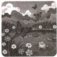 根据例子“天空雁群会写字”,结合插图中蝴蝶在花间飞舞、青蛙在池里叫的情景,用简单动词填空。蝴蝶的动作是飞舞,青蛙的动作是唱歌。