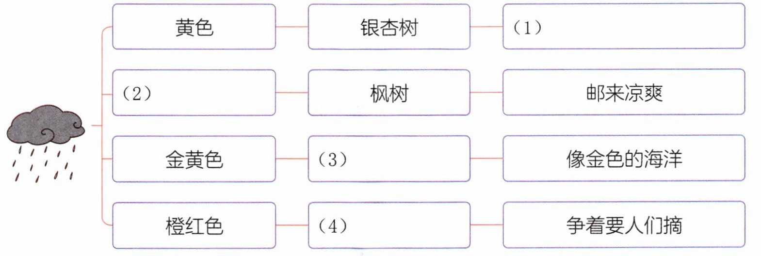 1.(思维导图)读了这一片段,小语给秋天的雨制作了一幅思维导图,请你把它补充完整。