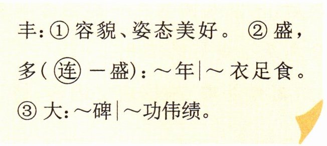 )。(填序号)丰:① 容貌、姿态美好。 ② 盛,多(连一盛):~年|~衣足食。③ 大:~碑|~功伟绩。